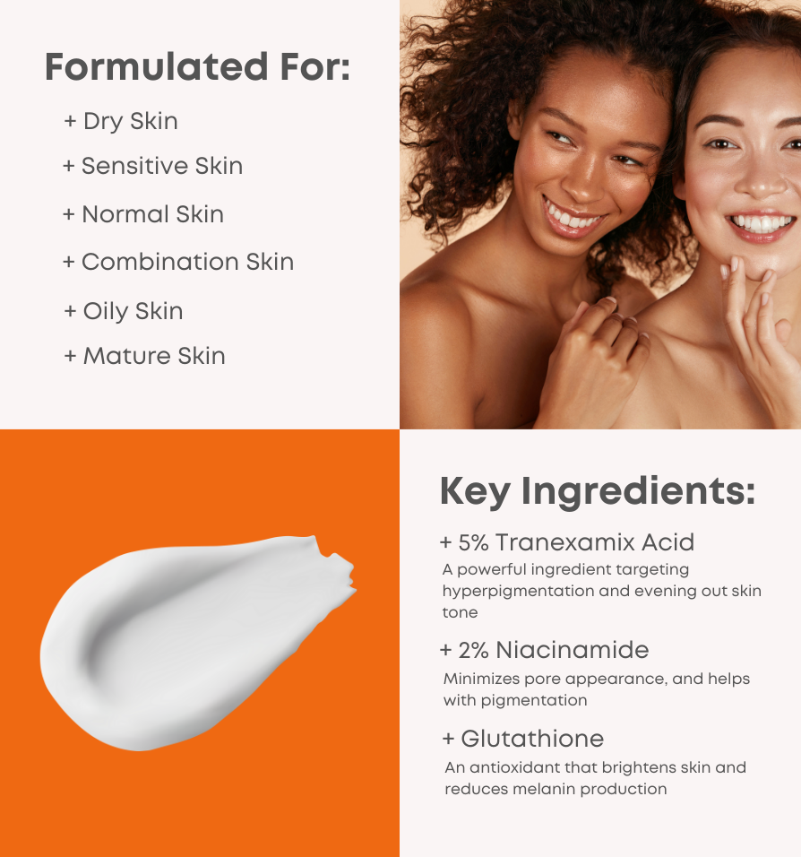 Este sérum contiene un 5 % de ácido tranexámico, un 2 % de niacinamida y glutatión, que ayudan a iluminar el tono de la piel, reducir la pigmentación y minimizar los poros.