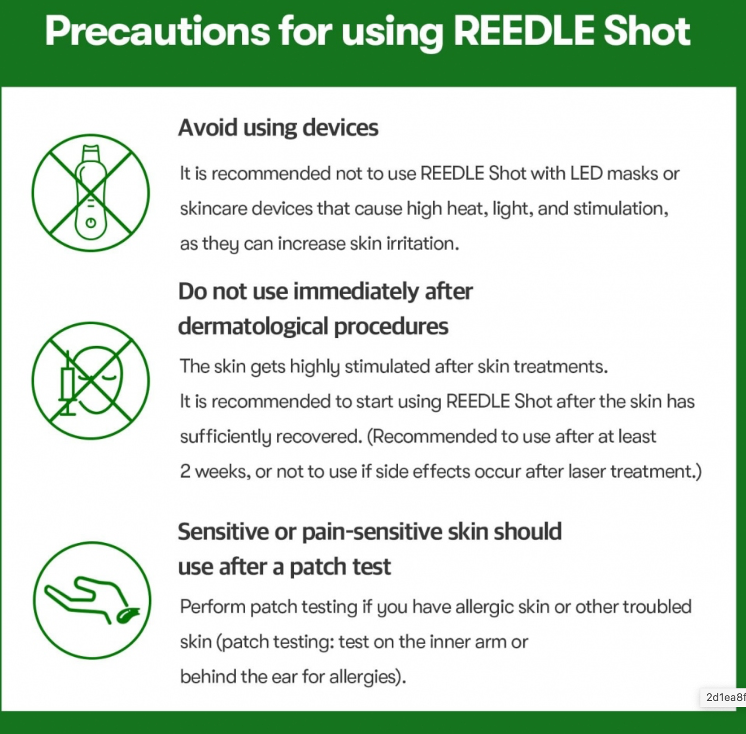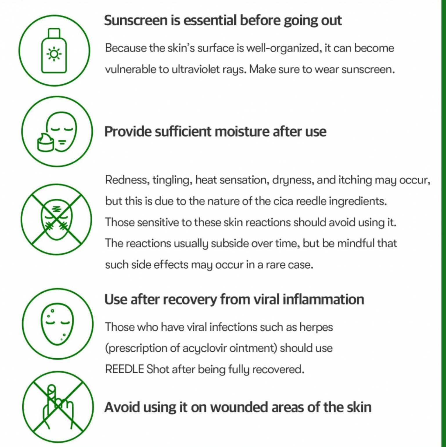 REEDLE SHOT puede ser utilizado por todo tipo de piel, pero se recomienda especialmente para quienes desean absorber adecuadamente los ingredientes de los productos para el cuidado de la piel, o simplemente eliminar las células muertas de la piel con una rutina diaria, o para quienes usan una variedad de productos para el cuidado de la piel pero no pueden sentir la diferencia.